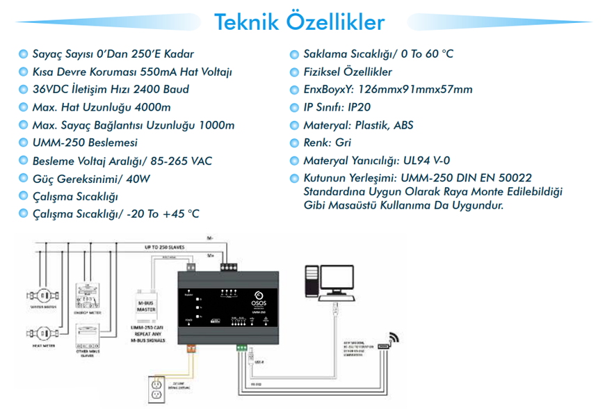 UMM-250 MBUS çevirisi 250 adet sayaca kadar sayaçların okunmasını sağlar.